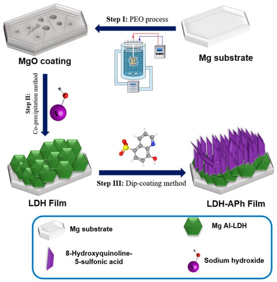 The synthesis of LDH film involved immersing PEO samples in an aqueous solution containing the molecule with chelating properties, sodium nitrate, aluminum and magnesium nitrate. The acquired solutions underwent pH adjustment to reach 10 ± 0.1 through the addition of NaOH solution. Afterward, the hydrothermal step was conducted with electromagnetic stirring at 80 °C for a duration of 8 h. Following the LDH process, LDH-MgO-coated specimens underwent dip chemical coating (DCC) involving the use of the 8-Hydroxyquinoline-5-sulfonic acid compound. Subsequently, the pretreated specimens were submerged in the organic solution for a duration of 12 h to promote the generation of a self-organized organic–inorganic combination. Next, the arranged specimens underwent rinsing with deionized water and ethanol, after which they were allowed to air-dry at ambient room conditions. The resulting procedure is detailed in Figure 1 to elucidate the synthesis steps.