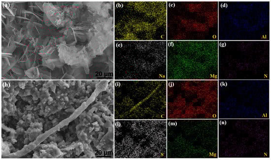 Surface morphologies and the corresponding EDS spectra of (a–g) the PEO-LDH material and (h–n) the HQS@LDH-PEO composite.