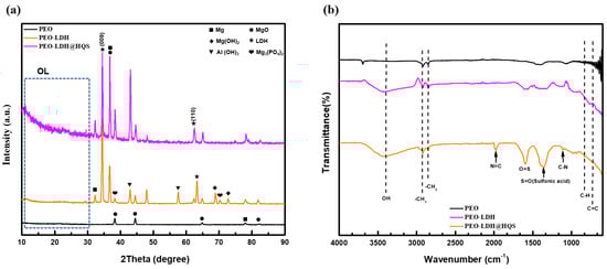 (a) XRD patterns and (b) FTIR analysis of the treated samples by PEO, treated samples by PEO methods followed by co-precipitation (PEO-LDH), and synthesized HQS@LDH-PEO composite fabricated by PEO and co-precipitation followed by DCC with HQS.