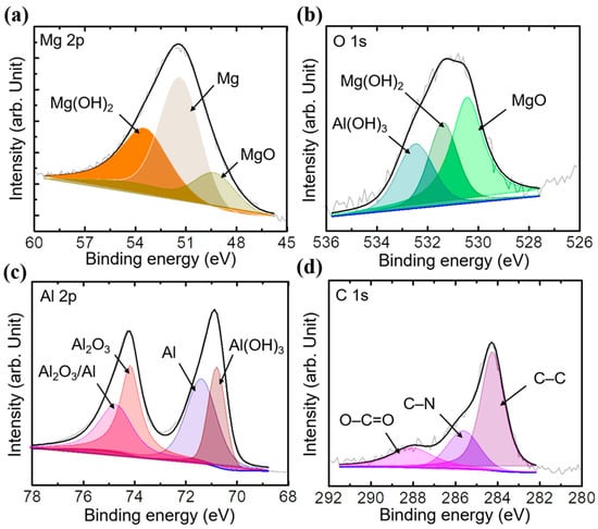 By using X-ray diffraction, the crystallization of the inorganic films and the hybrid HQS@LDH-MgO coating created on the metallic surface were further examined. Mg, MgO, and a trace amount of Mg3(PO4)2 were found in the sample produced by the PEO procedure, as shown in Figure 3a. The peak corresponding to MgO dominates in terms of relative abundance among all peaks, signifying that MgO constitutes the primary oxide within the inorganic layer, according to peak intensities. Additionally, two distinctive XRD peaks at 34.5° and 63.4° were indicative of the pure LDH phases’ (009) and (110) diffraction planes when compared to the pristine PEO, indicating an efficient association between the organic layer and LDH surface. Additional Mg(OH)2 and Al(OH)3 diffraction peaks were also observed, but with lower intensities, as a result of the interactions between the Mg, Al, and hydroxyl groups. These results show that the LDH layers are successfully applied on the MgO surface. Additionally, the HQS@LDH-MgO particle crystallinity was supported by the XRD patterns. The diffraction peak positions of the hybrid film are identical to the spectrum of the LDH phases, as shown in Figure 3a, proving that the as-fabricated LDH samples remained unaffected following surface modification. The presence of the HQS compound on the LDH layer affected the X-rays’ capacity to adsorb, which somewhat varied the peak intensity, and due to the X-rays considerable depth of penetration, the chemical phase of metallic Mg was identified. As a result of a chemical interaction between the active sites of the organic molecules and the (-OH) pertaining to the LDH framework, additional peaks belonging to the reflection peaks of HQS have instead emerged. In light of this, it is confirmed that the hybrid coating made by fusing the LDH framework and organic layer is verified. Figure 3b displays the FT-IR spectra of the self-assembled material, LDH structure, and PEO coating in order to show the bonding in the studied coatings. As can be seen from Figure 3b, the O-H stretching of hydroxyl groups could be the cause of a distinctive broad band exhibited at 3400 cm−1 [,]. Similarly, the spectrum of HQS@LDH-MgO affirms the existence of (-OH) groups derived from both the hydroxide groups of LDH and the organic compound, indicative of the deposition of the organic self-assembled layer onto the LDH structure. In the Mg-Al LDH system, the presence of bands at 2920 cm−1 and 2840 cm−1 can be attributed to the tensile vibration of the C-H group. This observation underscores the role of EDTA as a chelating agent, facilitating the successful production of LDH under ambient pressure [,,,]. These results are considered as a sign that the chelating molecule effectively forms complexes, demonstrating successful synthesis, and serve as strong confirmation of this conclusion. The appearance of peaks at 1970, 1342, and 1105 cm−1, which are attributed to N=C [,], S=O [,,,], and C-N [,], respectively, indicates that HQS was adsorbing, which was likely prompted by the emergence of an organic film covering the LDH architecture. Figure 3b provides additional evidence for the existence of the organic self-assembly on the layered coating material. Notably, new characteristic peaks within the range of 960 to 740 cm−1 are discerned, indicating the agglomeration of HQS molecules both on the surface and atop the morphological structural defects of LDH architecture. XPS measurements were employed to scrutinize the surface composition and bonding states of constituent elements across diverse coating layers. The hybrid coating’s narrow-scan spectra of Mg 2p, O 1s, C 1s, S 1s, and Al 2p were characterized. As shown in Figure 4a, the high-resolution Mg 2p spectrum may be deconvolved into three sub-peaks identified as MgO, Mg, and Mg(OH)2 and located at 49.4, 51.2, and 52.9 eV, respectively [,]. After curve fitting, three chemical states of the surface C atom were discovered (Figure 4d); the peak at 283.9 eV corresponds to the energy of the C-C bonds of the aromatic ring in the HQS molecule, and there are two further peaks at 285.9 and 288.1 eV, which are assigned to C-N and C=O bonds, respectively []. Additionally, the presence of sulfur highlighted the nucleation and growth behavior of the organic layer, which was manifested as a twig-like structure. Further structural analysis of the produced HQS@LDH-MgO material is performed using transmission electron microscopy, as displayed in Figure 5. The interplanar distances between the organic chains on the lamellar surface are represented by the measured lattice with spacings of 0.37 nm. The outcomes distinctly illustrate the effective interaction among the different components of the duplex structure film, providing strong confirmation of the successful development of the novel material HQS@LDH-MgO.