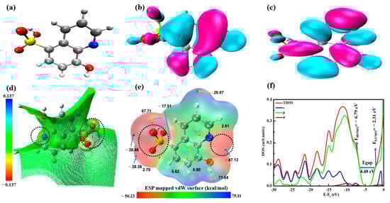 (a) Optimized geometry, (b) HOMO, and (c) LUMO orbitals of HQS molecule. (d) ESP statistical distribution on HQS molecular surface, (e) ESP-mapped molecular vdW surface with the local surface minima (cyan sphere) and maxima (yellow sphere) points of ESP. (f) Energetic position of molecular orbitals with energy gap and the contribution of different atomic orbitals (s, p, d) of HQS on the TDOS.