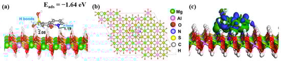 To explore the interfacial mechanism (e.g., adsorption configuration, bonding formation, and electron density difference (EDD)) of the HQS molecule on the Mg-Al LDH surface, first-principles calculations based on DFT were performed, as displayed in Figure 7a–c. It can be seen from Figure 7a that the molecular arrangement of the HQS molecule on the Mg-Al LDH layer is stabilized by the strong intermolecular interactions with hydroxyl groups [,]. Calculations reveal that the presence of lone-pair electrons and the π-current of the aromatic ring favor the interaction with the Mg-Al LDH surface. This is confirmed by the bond distances of 1.19 and 2.08 A°, measured from the two O atoms in the SO3 group and N atom of the HQS molecule to the surface of the Mg-Al LDH. These results indicate that the hydrogen bond strength is strong. In addition, the adsorption energy (Eads) reflects the strong bonding interactions between HQS and Mg-Al LDH layers with −1.64 eV, indicating the vital role of hydrogen bond interaction in the assembly process for the formation of the HQS@Mg-Al LDH composite []. Besides, EDD map in Figure 7c shows the accumulation and depletion of electrons at the interface of the Mg-Al LDH hybrid material. The charge distribution at the interface of the HQS@Mg-Al LDH composite is located on the intermolecular bonds formed with hydroxyl groups of Mg-Al LDH, suggesting that the charge transfer takes place between different active regions and Mg-Al LDH layers []. Overall, our findings indicate that HQS serves as a suitable linker for generating well-structured self-assemblies on LDH surfaces. This suitability arises from its capacity to act as both a H-bond donor and acceptor, alongside its π-conjugated molecular structure. Additionally, the functional groups play a crucial role in facilitating the inter- and intra- molecular interactions, contributing to the formation of the most stable self-assembled network.