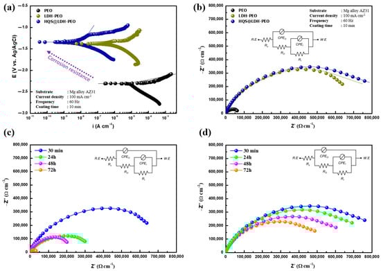 Corrosion properties of different systems after immersion in 3.5 wt.% NaCl solution: short-term (a) polarization curves and (b) Nyquist plots of PEO, PEO-LDH, and HQS@LDH-PEO composite. Long-term immersion by Nyquist curves of (c) PEO-LDH and (d) HQS@LDH-PEO.