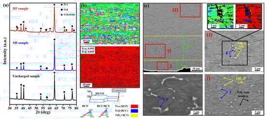 Microstructural analysis of the uncharged and the hydrogen-charged samples at the current density of 1 mA/cm2 (SH sample) and 50 mA/cm2 (HP sample) on the RD–TD plane: (a) XRD patterns of both hydrogen-charged and uncharged samples; (b) IPF and phase maps of the uncharged sample; (c) ECCI images and IPF and phase maps of the HP sample. Zone I: the HP fully transformed from α phase. Zone II: the HPs within the H-supersaturated α phase and at grain boundaries (GBs). Zone III: the HP at GBs.