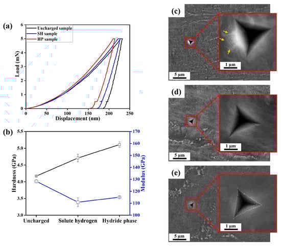 Nanoindentation measurement results: (a) load-displacement curves; (b) hardness and Young’s modulus; SEM images of indents in (c) the uncharged sample; (d) the SH sample; and (e) the HP sample. The orange arrows indicate pile-up.