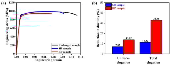 Comparison of mechanical properties among the uncharged sample, the SH sample, and the HP sample: (a) engineering stress–strain response; and (b) reduction in ductility from the stress–strain curve.