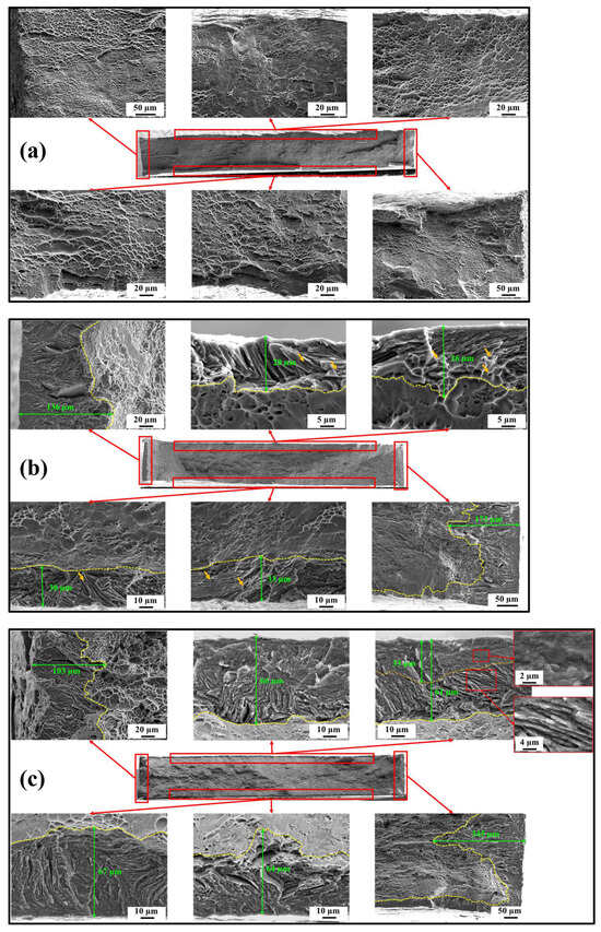 Fractography of (a) the uncharged sample; (b) the SH sample; and (c) the HP sample. The orange arrows indicate nano/micro-voids.