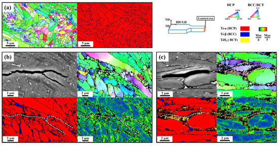 Figure 5 shows deformed microstructural images in the uncharged sample (a) and the hydrogen-charged samples (b,c) depicting hydrogen-assisted cracking behavior, specifically focusing on the secondary cracks observed in the cross-section view (ND–TD). It is crucial to emphasize that only hydrogen-charged samples exhibit secondary cracks near the fracture surface, which is indicative of hydrogen-assisted cracking behaviors [36]. The uncharged sample displays a colony structure (Figure 5a), while an intergranular cracking was clearly observed in the SH sample, as the crack exclusively propagated along the grain boundaries as well as the α/β interface, supporting the notion that the nano/micro-voids generated at the GBs or the α/β interface could be a preferred site for HE. Indeed, GBs are reported as preferred pathways for the diffusion and accumulation of solute hydrogen [26,27,28,29]. Furthermore, the differences in hydrogen solubility and diffusion rates of α and β phases also contribute to the α/β interface serving as a hydrogen trap [7,11,18,25]. On the contrary, HP-assisted cracking is demonstrated in Figure 5c, showcasing crack propagation in zone III of the HP sample. Herein, the cracks predominantly advanced through the HP at the grain boundaries. As discussed in the preceding sections, the α phase-to-HP transformation results in local strain within the HP. This phenomenon significantly contributes to both the initiation of nano/micro-cracks and the promotion of crack propagation. Consequently, the HP plays a crucial role in the crack propagation process. Overall, EBSD analyses confirmed the distinct influences of SH and HP in intergranular hydrogen-assisted cracking.