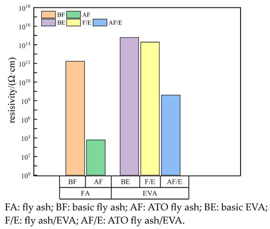 The surface electrical resistivity of pure EVA is 6.0 × 1014 Ω, which only changes slightly to 1.95 × 1014 Ω after filling with calcined fly ash. The surface electrical resistivity of EVA filled with ATO fly ash is significantly reduced to 4.0 × 108 Ω, indicating a substantial improvement in EVA’s antistatic properties.