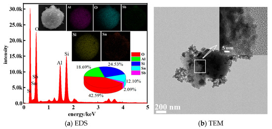 Figure 4a is the element distribution of antimony-doped tin oxide on the surface of fly ash when the coating amount is 25%. As can be seen from Table 1, fly ash contains Al, Si and O elements, but does not contain Sb and Sn elements. However, it can be seen from Figure 4 that Sn and Sb elements appeared on the surface of the composite powder after surface coating, accounting for 2.09% and 12.11%, respectively. The proportion of the two elements is similar to the molar ratio of Sb–Sn when coated with fly ash. Therefore, when the chemical precipitation method is used to coat the fly ash, the loss of the coating agent is less. The elemental scanning image taken by EDS shows that Sb and Sn are evenly distributed on the surface of fly ash. Figure 4b is the TEM image of ATO fly ash. The spherical fly ash appears dark, contrasting with the lighter outer ATO layer, indicating complete coverage. The lattice spacing (d) measured by Image J is 0.29 nm, which is consistent with the lattice spacing of SnO2 [19]. It can be seen from Figure 4a,b that the surface of fly ash is successfully coated with ATO.