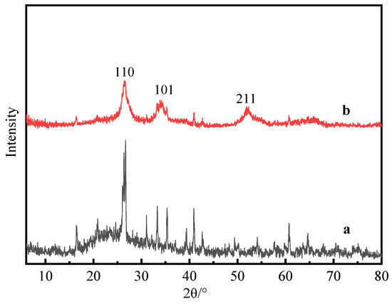 Figure 5 is the XRD pattern of calcined fly ash and composite powder. Figure 5a shows the XRD spectrum of calcined fly ash, with its primary crystalline phases including mullite, sillimanite, and quartz. Figure 5b is the XRD pattern of calcined fly ash surface-coated with nano antimony-doped tin oxide (ATO). Compared with calcined fly ash, the intensity and position of the ATO diffraction peak changed significantly. As can be seen from the figure, there are obvious SnO2 (JCPDS: 41-1445) crystal phases on the (110), (101) and (211) crystal planes, and similar results were obtained also by other authors [20]. However, due to the low doping amount of antimony, there is no obvious antimony crystal phase.