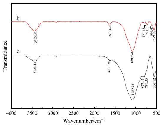 Figure 6 is the infrared absorption spectra of calcined fly ash and composite powder. Figure 6a, representing the infrared spectrum of calcined fly ash, identifies the stretching vibration and bending vibration of O-H at wavenumbers of 3433.12 cm−1 and 1618.19 cm−1 [21]. The bending vibration of Si-O appears at the wave number of 559.32 cm−1 and the stretching vibration of Si-O-Si appears at the wave number 1089.72 cm−1 [22,23]. Figure 6b is the infrared absorption spectrum of ATO fly ash composite powder. The O-H-stretching vibration appears at the wave number of 3435.05 cm−1. Compared with Figure 6a, the O-H peak of the composite powder moves, and the stretching vibration intensity of the O-H of the composite powder increases. This is because the chemical precipitation method is carried out in an aqueous solution, and the water contains ionized H+ and OH−, so the O-H-stretching vibration intensity of the composite powder increases accordingly. The Sn-O-Sn antisymmetric peak of SnO2 appears at 609.47 cm−1, and a new peak emerges at 727.12 cm−1, which is the interaction between amorphous SiO2 and SnO2 [24,25]. The Si-O-Si-stretching vibration absorption peak appears at the wave number of 1087.80 cm−1. Compared with the FTIR of calcined fly ash in Figure 6a, the wave number of Si-O-Si decreases from 1089.72 cm−1 to 1087.80 cm−1, which is due to the combination of SiO2 with Sn4+ and Sb3+ to generate Si-O-Sn (Sb).
