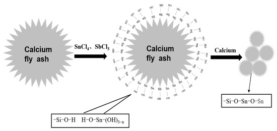 The mixed solutions of SnCl4 and SbCl3 and NaOH were added dropwise into a fly-ash suspension. Sb3+ and Sn4+ reacted with the water in the fly-ash suspension to form SbO+ and Sn(OH, which were deposited on the surface of the fly ash [26]. The reaction equations of this process are (3) and (5). After washing, precipitation and filtration, it was transformed into Sb2O3 and SnO2·2H2O. The reaction equations are shown in (4) and (6). The Si-O-Si bond in the fly-ash solution was ionized to generate (Si-O)− and Si+, and the ionized H+ and OH− in the water combined with it to generate Si-OH. The O-H bond is also partially ionized and converted into (Si-O)−, which makes the fly ash negatively charged and attracts the positively charged Sn4+ and Sb3+ in the solution, so the Si-O-Si-stretching vibration intensity decreases in FTIR. In addition, the remaining Si-OH will condense with the surface group Sn(Sb)−OH of the Sb-Sn hydrolysate to form the Si-O-Sn (Sb) bond [27]. Sb-SnO2 with a rutile structure is formed after high-temperature calcination, which has a conductive function [28]. The specific reaction Equations (3)–(6) and mechanism of the formation process of antimony-doped tin oxide in the antistatic layer on the surface of the fly ash are shown in Figure 7.