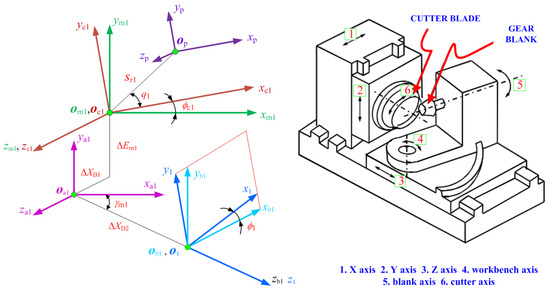 Within the realm of aerospace spiral bevel gear manufacturing, it is possible to conceptualize the spatial trajectory of each cutting blade edge during high-speed rotation as akin to a conical surface. This analogy allows us to envision it as a “tooth” on the generating gear [2]. In light of the kinematic relationship between the simulated generating gear and the workpiece blank, the tooth surface is generated through the enveloping of the surface of the imaged generating gear [2]. The machine kinematics [28,29,30] can be simulated by applying coordinate transformation with respect to the machine tool settings. A basic mathematical model for the tooth surface can be built using a machine kinematics simulation of the cutter blade cutting the work blank, where this process needs to satisfy the gearing theory [33]. In this context, the modeling of the tooth surface is achieved by implementing a kinematic coordinate transformation, transitioning from the tool coordinate system to the gear coordinate system. It is of great significance to determine the coordinate transformation matrices representing the machine kinematics from the cutter blade to the gear work blank.