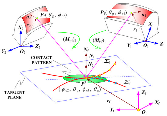 Figure 3 provides a schematic representation of the TCA kinematics for aerospace spiral bevel gears. To accomplish the meshing process, the contact point P2(θp, ϕc1) of the pinion tooth surface rotates to a certain angle through the transformation matrix M2−f and the contact point P1(θg, ϕc2) of the gear tooth surface rotates to a certain angle by M1−f at the same time. Finally, the pinion and gear make contact at point P*(θg, ϕc2, θp, ϕc1)) in the meshing coordinate systems. The established set of TCA equations must adhere to the following basic conditions: