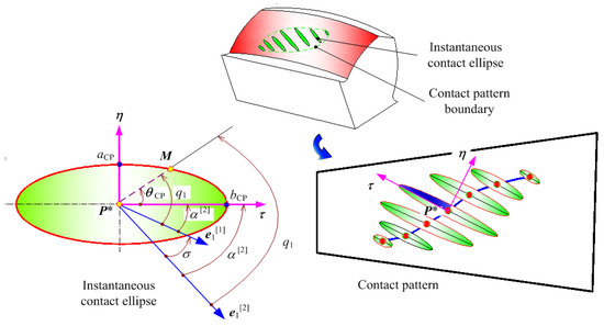 All of the individual instantaneous loaded contact ellipses collectively form the entire contact pattern [34]. This ellipse is defined within a plane coordinate system denoted as Γ(t, h), with its center situated at the determined contact point Π∗(ϕχ1, θπ, ϕχ2, θπ). Here, It is worth noting that this assumption holds, considering that the dimensions aCP and bCP are relatively small in comparison to the tooth dimensions and the tooth surfaces approach flatness. When considering an ellipse with its center at point P*, its axes precisely align with the coordinate axes h and t. The representation of the contact pressure distribution within the tooth contact pattern can be succinctly expressed as