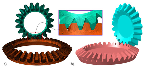 Spiral bevel gears are increasingly demanded for torque or speed transformation in many industrial applications [1]. Especially in the aerospace industry, in order to satisfy the increasingly high transmission requirements of low noise and high strength, loaded meshing transmission performance evaluations are needed to be guaranteed during the design and manufacturing. Actually, loaded meshing transmission performance evaluations have always been required for spiral bevel gears. For instance, no loaded edge contact, no stress concentration, a reasonable loaded transmission error, and a good contact pattern are usually prescribed as important evaluations for noise and strength [2]. In recent research on the tooth contact analysis (TCA) technique, the simulated loaded tooth contact analysis (SLTCA) based on an economical finite element software package has always been an important access to loaded meshing interface state prediction and contact mechanical performance optimization before the actual flank manufacturing [3,4,5]. Here, loaded meshing transmission performance evaluations mainly include contact pressure, contact stress, root bending stress, the loaded contact pattern, and the loaded transmission error [6,7]. Argyris et al. [4] developed a computerized method to analyze the tooth contact and stress of spiral bevel gears.