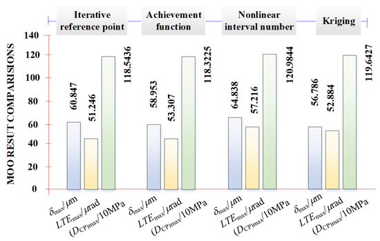 Focusing on the given loaded meshing transmission performance evaluations, especially for their maximum values, Figure 11 shows the numerical comparisons with the recent main MOO algorithms. First, the sub-objective evaluation results of various MOO methods do not have many differences and they can verify the optimization accuracy of the proposed method. Where, the maximum δmax is 64.838 μm from the nonlinear interval number method, while the minimum is 56.786 um from the Kriging method [11]. The maximum LTEmax is 57.216 μrad from the nonlinear interval number method, while the minimum is 51.246 μrad from the proposed method. The maximum (DCP)max is 1209.844 MPa from the nonlinear interval number method, while the minimum is 1183.225 MPa from the proposed method. It shows that the most optimal MOO design for the spiral bevel gear transmission is the one under consideration.