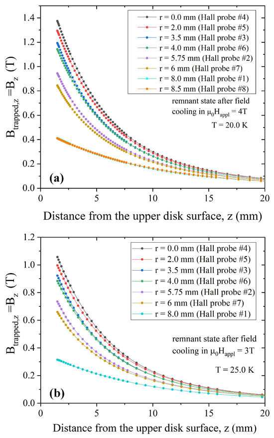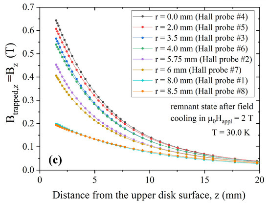The magnetic flux density trapped in the MgB2 disc was measured by eight Hall probes, whose disc-shaped active area has a diameter of 300 μm. The Hall probes were distributed along the MgB2 disc’s diameter (Figure 2b). The external field was always applied parallel to the sample axis (henceforth referred to as the z-axis) at a temperature, T, of 50 K, then the sample was cooled down to the working temperature and the field was removed. The Hall probes were always positioned to measure the component of the magnetic flux density parallel to the applied magnetic field (). During cooling and the external field removal, the distance between the Hall probes and the top surface of the sample was kept constant and equal to 1.5 mm. Once the remnant state was reached (i.e., = 0), the magnetic flux density was measured as a function of the distance between the Hall probes and the sample surface. To this aim, the Hall probes were mounted on a holder moving with micrometric resolution along the z-axis [53]. All measurements were performed in a vacuum, with the disc placed in tight thermal contact with the second stage of a cryocooler.
