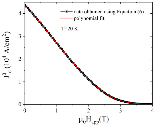 dependence on the applied magnetic field at T = 20 K obtained from the vs. curve measured at r = 0 (Hall probe #4) applying Equation (6) (black symbols) and calculated with a polynomial fit (see text—red solid line).