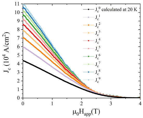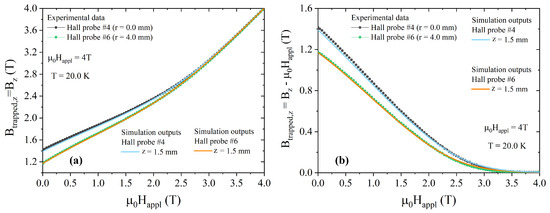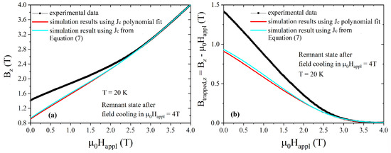 The curve was then fitted using a polynomial law, and the resulting dependence on magnetic field was entered into Equation (5) and used to recalculate the magnetic flux density. As can be seen in Figure 5, the agreement between the experimental and as-calculated magnetic flux density curves (red solid line) only occurs at high magnetic fields, i.e., above the full penetration field, that for this sample, at 20 K is ≈ 2.5 T. This could be related to the fact that Chen’s method, based on the Bean model hypothesis, assumes a constant critical current density. Indeed, as shown by Chen and Goldfarb [56], the Bean model could give deceptive results when used to estimate the critical current density below the full penetration field, i.e., when is strongly dependent on Happl.