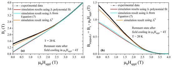 Comparison between the experimental (symbols) and numerically computed (lines) magnetic flux density (a) and trapped field (b) values, both plotted as a function of the applied magnetic field. The computed curves were obtained using the polynomial law plotted in Figure 4 (red curve), the exponential in Equation (7) (cyan curve), and the polynomial law extracted following the procedure described in the main text (orange curve). The measurement was carried out at 20 K, decreasing the applied field after field cooling in an external field = 4T. Data refer to Hall probe #4 position, placed on the sample’s axis, 1.5 mm above the disc top surface.