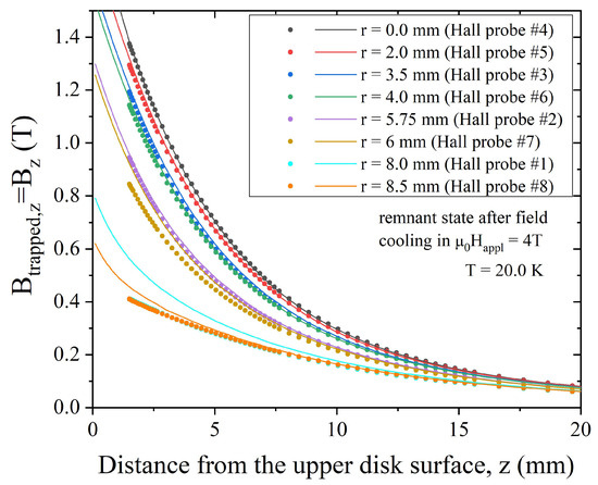 where R and h are the radius and the height of the disc, respectively, and z is the distance of the Hall probe #4 from the top of the sample. It is worth mentioning that since Equation (6) refers to trapped flux density values measured on the sample axis, the flux density magnitude here coincides with its z component. First, we applied Equation (6) to the measured at 20 K, obtaining the values plotted in Figure 4.
