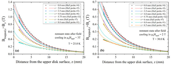 Comparison between the magnetic flux density measured by all of the Hall probes as a function of the distance from the top surface of the disc, at T = 25 K (a), and T = 30 K (b) after field cooling in an applied field of = 3 T and 2 T, respectively (symbols), and the corresponding values computed by numerical simulations (lines).