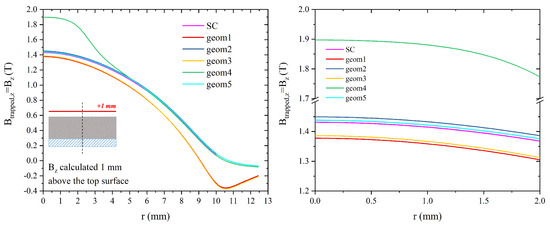 Figure 12 shows a comparison of the magnetic flux density calculated 1 mm above the top surface for all the hybrid arrangements as a function of the distance from the layout’s symmetry axis (i.e., z-axis). For the sake of clarity, a magnification of the zone close to the axis is plotted in the right panel of the figure. Notably, the hybrid layouts referred to as geom1 and geom3 exhibit a trapped field degradation in comparison to the superconducting disc alone, while layouts geom2 and geom5 provide a slightly better field-trapping ability than the MgB2 disc. Conversely, a Bz peak value of 1.90 T is achieved with configuration geom4 in correspondence to the z-axis. It is worth mentioning that the positive effect of the FM addition in this layout persists all along the disc radius up to about . The results are partially comparable to those obtained in the literature for similar hybrid configurations. Specifically, in references [32,48], slight improvements were reported for all the proposed hybrid configurations, including the configurations we defined as geom1 and geom3. This different behaviour could likely be attributed to the superior initial performance of the MgB2 magnet compared to that obtained with YBCO magnets, which could make the role of the FM layer not so effective for these configurations.