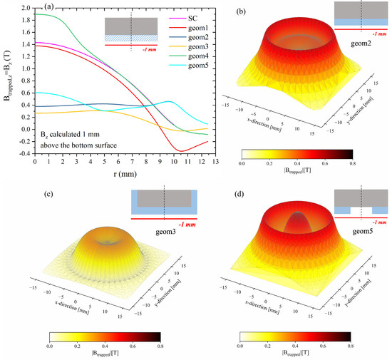 However, in agreement with [31,32], the addition of an FM layer also produces a strong decrease in the trapped magnetic flux density near the surface covered with the FM layers of layouts geom2, geom3, and geom5. In these samples, deterioration of the field-trapping ability of up to 74, 81, and 58%, respectively, was observed, as shown in Figure 13, where the values are plotted as a function of the radial position (a) and the 3D maps of the magnitude of trapped field are depicted for geom2 (b), geom3 (c), and geom5 (d). As expected, this asymmetric behaviour does not occur in layouts geom1 and geom4 that show the same field-trapping ability both above and below the sample.