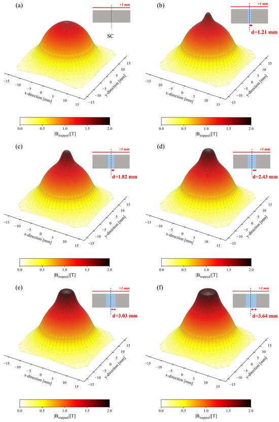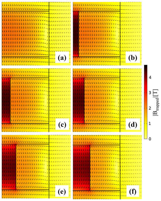Based on these results, it is evident that arrangement geom4 exhibits the highest efficiency among those investigated. Consequently, we proceeded to examine how the trapped field profile varies as the diameter of the hole in the superconductor increases. In all cases, we assumed that the hole was completely filled with iron and kept constant the outer radius of the superconducting disc. Specifically, four other values were considered for the radius of the ferromagnetic cylinder in addition to mm: mm, mm, mm, and mm. Figure 14 shows the comparison of the magnitude of the trapped field values calculated for the superconductor alone (Figure 14a) and the layout geom4, the latter as the radius of the FM component increases (Figure 14b–f).