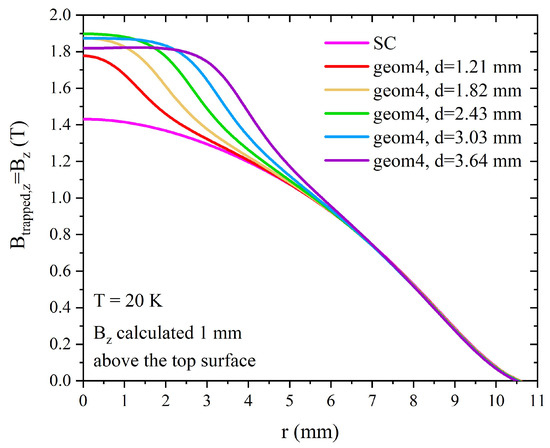 The effect of the ferromagnetic component addition in this layout is twofold. First, the trapped field value at the center of the disc (r = 0) improves with the addition of the ferromagnetic cylinder, reaching a maximum value of = 1.89 T with a ferromagnetic radius of 2.43 mm (Figure 15). Notably, a larger radius of the FM cylinder (d = 3.03 mm and d = 3.64 mm), leads to a decrease of the trapped flux density, the value of which nevertheless remains greater than that obtained with the superconducting disc alone. Concurrently, the addition of the FM layer extends the overall capability of the sample to trap higher values of magnetic flux, even at a radial distance from the disc axis greater than the FM cylinder radius. For instance, considering the maximum value of the SC disc at r = 0, = 1.43 mm, the same value is reached at r = 2.19 mm, r = 2.70 mm, r = 3.20 mm, r = 3.65 mm, and r = 4.10 mm when employing FM cylinder with a radius of mm, mm, mm, mm, and mm, respectively.