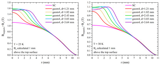 The improvement and radial behaviour of the trapped flux density achieved with this layout, assuming a working temperature of 20 K, were also confirmed using the () dependence reported in Equation (7) with the fitting parameters found at 25 K and 30 K (see Table 1). Figure 17 illustrates the values calculated 1 mm above the top surfaces of the hybrid geometries at operating temperatures of 25 K (left) and 30 K (right). In both the cases, one can again observe a maximum value of trapped flux density when the radius of the ferromagnetic cylinder is 2.43 mm. Nevertheless, the inclusion of the FM component strongly enhances the trapped flux density as at 20 K, expanding its positive effects also on a radial distance larger than the FM cylinder radius.