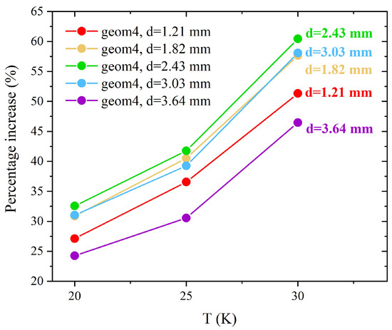 As expected, the influence of the FM cylinder becomes more pronounced as the temperature rises, mitigating the decline in superconductor performance. This trend is evident in Figure 18, where the percentage increase of the magnetic flux density trapped in the remnant state by the various layouts geom4 with respect to the flux density trapped by the only superconducting disc is plotted as a function of the operating temperatures. At all of the investigated temperatures, mm is the optimal FM radius above which the performance of the hybrid configurations begins to deteriorate. By way of example, at T = 30 K, a maximum increment of 60.4% is obtained using geom4 with mm (green curve), while increments of 58 and 46.4% are obtained employing geom4 with mm (cyan curve) and mm (purple curve), respectively.