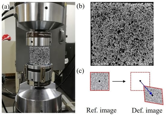 Experimental setups of uniaxial compression using an MTS machine (a) to load the specimens with speckles (b) spread on the surface of cubes calculated using the DIC method (c).