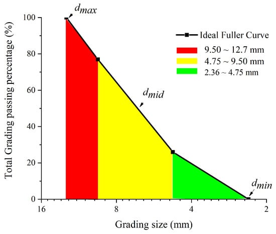 where is the corresponding passing percentage (%), d is the diameter of each grading class, and is the maximum aggregate diameter. In this study, the maximum size, , was 12.7 mm, and n is an exponent of the chosen grading curve. Generally, n is taken as 0.5, which was used in this model.