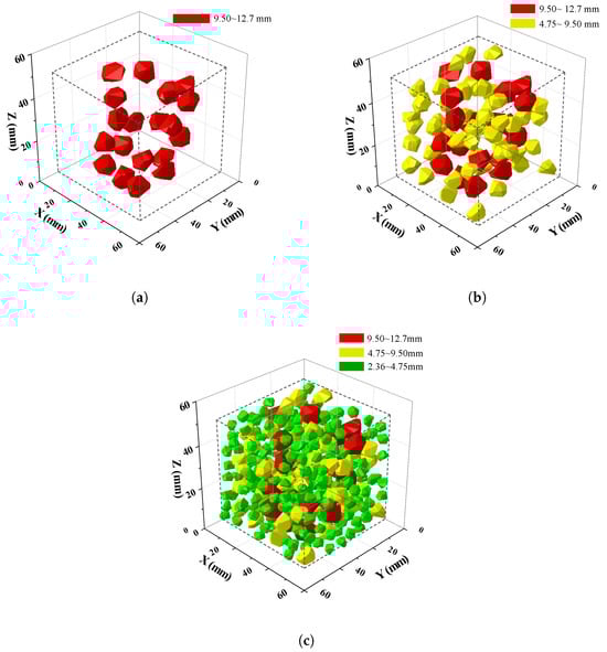 Figure 4 shows the spatial distribution of aggregates in a 50 mm × 50 mm × 50 mm cube with three different grading sizes ranging from 2.36 mm to 12.7 mm. It can be observed that coarse aggregates are randomly placed in the cube, guaranteeing no intersection between any two of them.