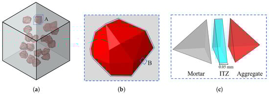 Generally, primary macro-cracks originate at weakened interfaces or within the inner voids between the mortar matrix and coarse aggregates. Discrete cracks often exhibit pronounced curvature along aggregate grains, but seldom propagate through a single weak aggregate grain. Therefore, a three-phase meso-scale model, including a mortar matrix, aggregates, and an ITZ, was most widely employed in previous meso-FE numerical studies on concrete. An ITZ was observed to possess a layered structure characterized by lower density and reduced mechanical strength in comparison to the surrounding mortar matrix. Skarzynski [] et al. measured the width of ITZs using a scanning electron microscope with a magnification factor of 30,000, and found that the width of ITZ layers along the aggregate particles was arranged from 30 to 50 m.
