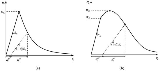 The CDP model is a continuum, plasticity-based damage model of concrete []. There are two main failure mechanisms assumed in this model, namely (1) tensile cracking and (2) compressive crushing. Under uniaxial tension loading, the stress–strain response followed a linear elastic relationship before the onset of tensile cracking. Once the load reached the failure stress, , it began to form, leading to softening in the stress–strain curve at a macroscopic level. Under uniaxial compressive loading, the stress–strain response exhibited linearity up to the yield stress, . Subsequently, there was a phase of relatively weakened plastic hardening before the stress–strain response transitioned into softening beyond the ultimate stress, . The typical stress–stain curves of tensile crackingand compressive crushing are shown in Figure 6. The stress–strain relations at the failure stage are governed by scalar damaged elasticity, as shown in Equation (5).