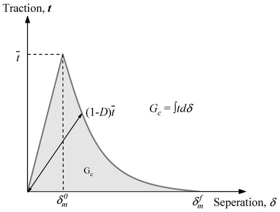 In this work, a quadratic nominal stress criterion was set to describe the damage initiation of cohesive elements. When the nominal stress ratio reaches 1, the damage is assumed to initiate as expressed by Equation (17):