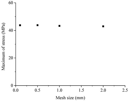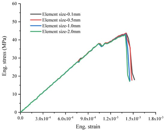 The mesh-generation process was hereby divided into two steps: In the first step, the initial mesh of tetrahedron elements without cohesive elements was defined using Abaqus. In the second step, the cohesive elements were placed between the solid elements of the mortar matrix and aggregates. The mesh convergence was discussed using four mesh sizes arranged from 0.1 mm to 2 mm (Figure 8), which was the average length of the elements. Figure 9 provides the engineering stress–strain curves with different element sizes. While minor variations in mesh configurations might result in slight changes in the numerical stress–strain curves, the engineering stress–strain curves remained fairly comparable until the stress approached its maximum. The significant disparity in the stress–strain curves typically occurred during the post-failure stage. Although slightly different meshes could lead to a slight change in the numerical stress–strain curves, the engineering stress–strain curves were quite comparable before the stress reached the maximum. The main difference of the stress–strain curves was reflected in the post-failure stage. Figure 10 shows the maximum compressive stress with different mesh sizes, where a quite close maximum compressive stress can be clearly observed. From the result, it was deduced that the mesh dependence was negligible for the selected element sizes before the loss of strength. Thus, an element length of 1 mm was selected in this study, though finer meshes would lead to a high computational cost. The element information of components is shown in Table 4 in detail.