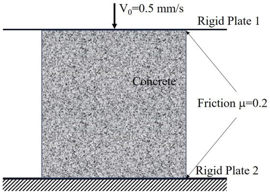 A numerical compression test was carried out with the consideration of the contacting friction between the rigid plate and the concrete cube, as shown in Figure 11. The friction factor was taken as = 0.2, which represents the boundary condition of static friction. In this study, all freedoms of the bottom plate (Rigid Plate 2) were constrained. In the vertical direction, a displacement boundary condition was allowed with a constant velocity of 0.5 mm/s for the upper plate (Rigid Plate 1), where other freedoms were constrained.