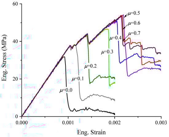 In most previous studies, concrete is usually assumed to be a homogeneous material. In fact, concrete is a kind of heterogeneous composite material consisting of coarse aggregates, a mortar matrix, an interface transition zone (ITZ), and voids [,]; concrete’s macro-scale strength and failure must be related to the mechanical performance of these components at a meso- or micro-scale. A meso-finite-element model provides the possibility to bridge the meso-scale behavior of components and the macro-scale response of structures [,,]. The components are usually distributed randomly in the concrete, which makes the experimental results unrepeatable. The numerical meso-scale finite-element (FE) method provides the possibility of generating an ideal material with the same component percentages and distribution. Zhang [,] constructed a meso-finite-element model to simulate uniaxial compressive tests on concrete while considering the connecting friction. The results showed that the frictional constraint had a strong influence on the peak stress value and the softening phase. When the frictional coefficient increased from 0.1 to 0.3, the peak stress could have a significant increase of up to 126%.