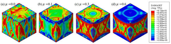 where and are the Young’s and Kirchhoff’s modules of the weaker concrete, respectively. Here, and were set to be the same as those of the mortar. Generally, a weakening ratio factor was assumed to describe the ratio of the material strength between the ITZ and mortar. The weakened ratio factor was arranged from 0.5 to 0.9, the same as that of previous meso-scale numerical models of concrete. In this study, the ratio was set as 70% [,], which is acceptable for a general range.