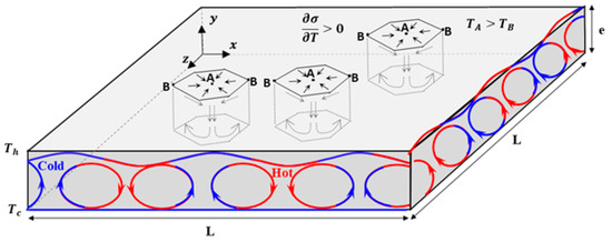 The simulation domain is represented in Figure 1 as a shallow rectangular ingot of thickness “e” and length “L” filled with molten Fe-0.82wt%C alloy. The side surfaces are assumed to be adiabatic; meanwhile, the bottom and the top surfaces have cold and hot temperatures, noted as Tc and Th, respectively. The top surface is treated as a free surface in contact with air. Therefore, a positive coefficient of the surface tension is applied on the top surface, which means that the surface tension increases with increases in the temperature. The nonuniform temperature at the top surface (induced by the surface tension) and within the ingot thickness (induced by the vertical temperature gradient) leads to the formation of original flow patterns and convective cells, as depicted in Figure 1. The direction of the flow within these cells is related to the temperature coefficient of the surface tension , which will be discussed later.