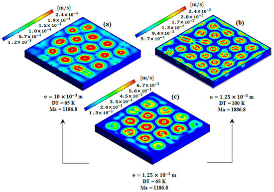 Velocity field for different configurations of geometry and thermal gradient. The thermal gradient and the ingot thickness for cases (a–c) are DT = 65, 100, 65 K and e = 10, 1.25, and 1.25 mm, respectively.