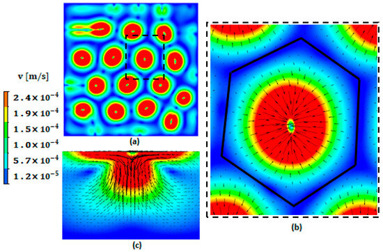 Figure 3 represents the velocity field (colored magnitude levels and black vectors) at the free surfaces (a) and (b) and on the cross-section presented in (c). The Marangoni effect is the mass transfer along an interface between two fluids due to the surface tension gradient (fluid from areas with low surface tension is transferred to areas with higher surface tension) [23]. The Marangoni flow dominates the flow within the hexagonal cells (Figure 3a). However, a downward flow is generated by RBM convection at the centers of the hexagonal cells, as shown in Figure 3c. According to [23], the sign of the temperature gradient of the surface tension () determines the direction of the fluid flow at the surface tension. A negative value of indicates that the surface tension () reduces with increasing temperature, prompting a radial outward flow. Conversely, a positive surface tension gradient leads to a radial inward flow, as shown schematically in Figure 3, which is the case in the present study.