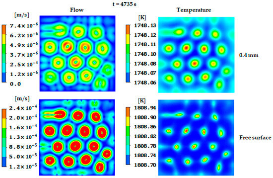In this section, the flow pattern at the free surface before the solidification is investigated. Numerous mesh refinements were tested to examine the convergence of the model implemented and the minimal mesh size, which ensures the mesh’s independence of the given solution. The transport equations discussed in Section 2 were solved using the pressure–velocity coupling SIMPLEC method within the finite volume method. To achieve convergence, up to eight iterations were performed for each 0.01 s timestep, to reduce the normalized residuals. The convergence criteria for the continuity equations, the momentum equations, and the solute equations were all set to 10−3, while 10−6 was chosen for the enthalpy equations (Equation (8)).