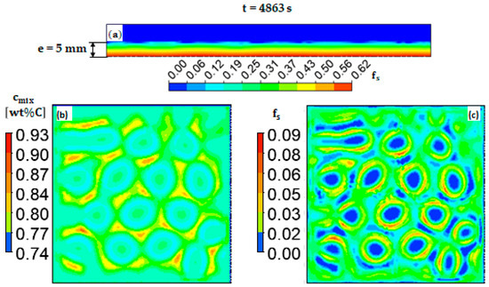 In this section, the solidification of the alloy is allowed and the impact of the flow pattern on the segregation structure is investigated. Thus, a convection heat transfer boundary condition with a heat transfer coefficient (HTC) of was imposed along the free surface to govern the amount of heat transferred between the molten metal and the surroundings. A large heat transfer coefficient of was also applied to the bottom surface to promote the growth of the columnar grains from the bottom upward. The formed solid fraction and the carbon concentration in the mixture (segregation pattern) when the solidification front reached the middle height of the ingot (at e = 5 mm) after t = 4863 s is shown in Figure 5. The columnar dendrite trunks exhibit higher close to the cold bottom of the ingot and decreases gradually towards the hot top (Figure 5a). As expected, the solid fraction and the segregation structures formed at e = 5 mm above the ingot bottom have shapes analogous to the hexagonal convection cells formed at the free top surface. This behavior is mainly due to the Marangoni flow generated by surface tension, which is produced by the hexagonal structures throughout the liquid depth. However, a higher solute concentration was noted around the cells.