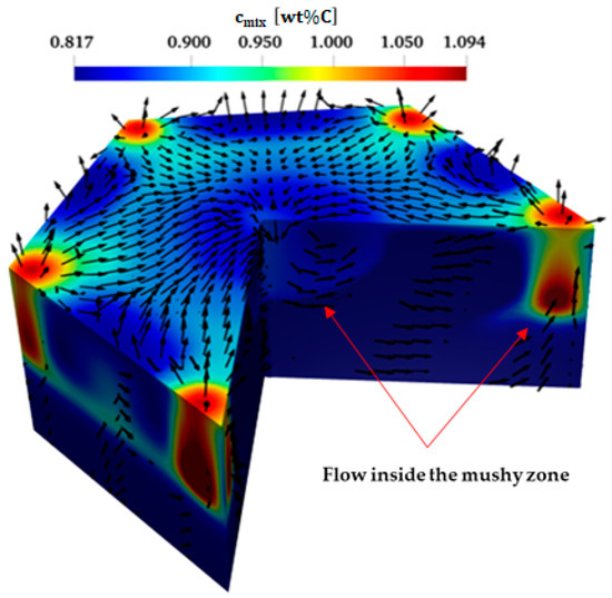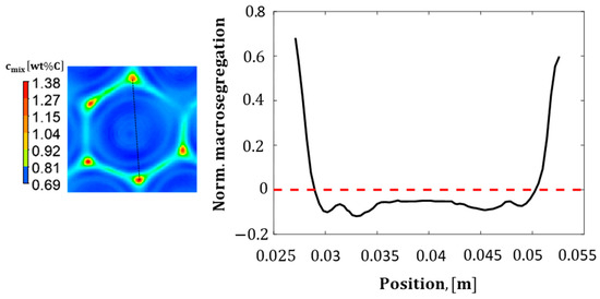 The mechanical properties and the melting point of carbon steel are very sensitive to the steel’s carbon content. The carbon content within the solidification ingot was subjected to dramatic variations, as shown in Figure 8; it may reach ~1.6wt%C at certain segregation nodes. This value is very close to the those in the cast iron composition range. In these areas, a large amount of the hard and brittle ‘cementite’ micro-constituent may be formed; in contrast, the other carbon-depleted areas contain a more ductile phase, ’ferrite’. On the other hand, the C-rich areas exhibit lower liquidus temperatures that may cause partial melting during the subsequent heat treatment processes of steel. Furthermore, a structural failure is expected to occur at the brittle nodes during the subsequent deformation processes. Therefore, the current analysis may assist researchers and industrial developers in building an understanding of the origins of segregation in depth; this is the key to avoiding or minimizing its formation. An area plot of the positive/negative segregation values in terms of normalized macro-segregation () [24] within one convection cell is presented in Figure 10, with the initial alloy composition being given by the value of 0; in contrast, positive and negative macro-segregations are being given by values above or below zero, respectively [24]. The result presented in Figure 10 (on the left) shows the contours of the mixture’s concentration. The carbon-rich areas are highlighted in red; meanwhile, the carbon-depleted regions are shown using blue. Figure 10 (on the right) illustrates the normalized macro-segregation along the black dashed line drawn through the hexagonal cells, as per Figure 10 (left). The results indicate a positive segregation at the edge of the hexagonal cell and a fluctuating negative segregation in the inner region of the hexagon.